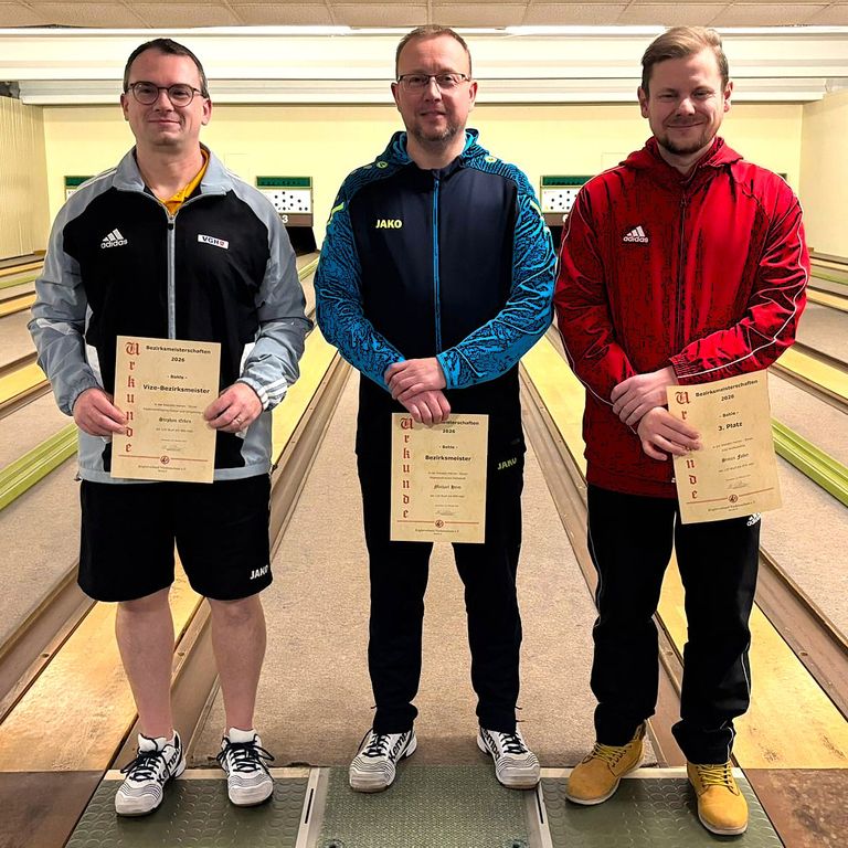 v.l.n.r.: Stephan Ecken (2. Platz/882 Holz) von der Keglervereinigung Goslar, Michael Heim (Bezirksmeister/890 Holz) vom KSV Helmstedt und Simon Faber (3. Platz/876 Holz) von der KSG Wolfenbüttel.